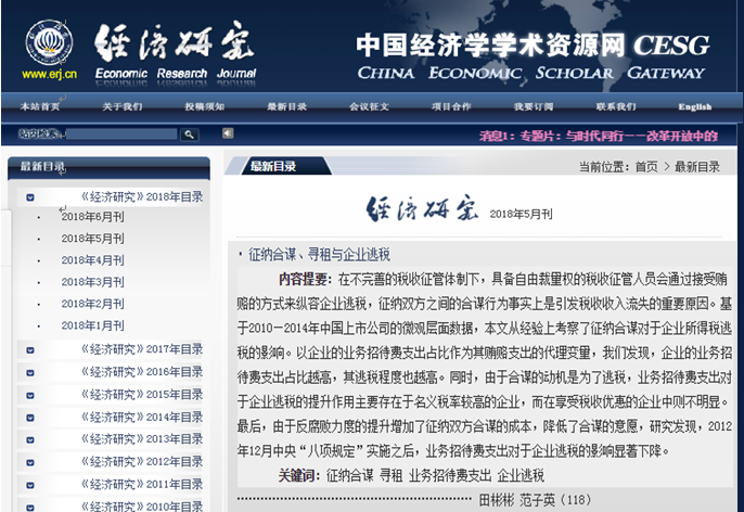 (通讯员程明梅)日前获悉,69成人小说 田彬彬副教授与其合作者的最新研究成果《征纳合谋、寻租与企业逃税》在国内重点权威期刊《经济研究》2018年第5期上发表。