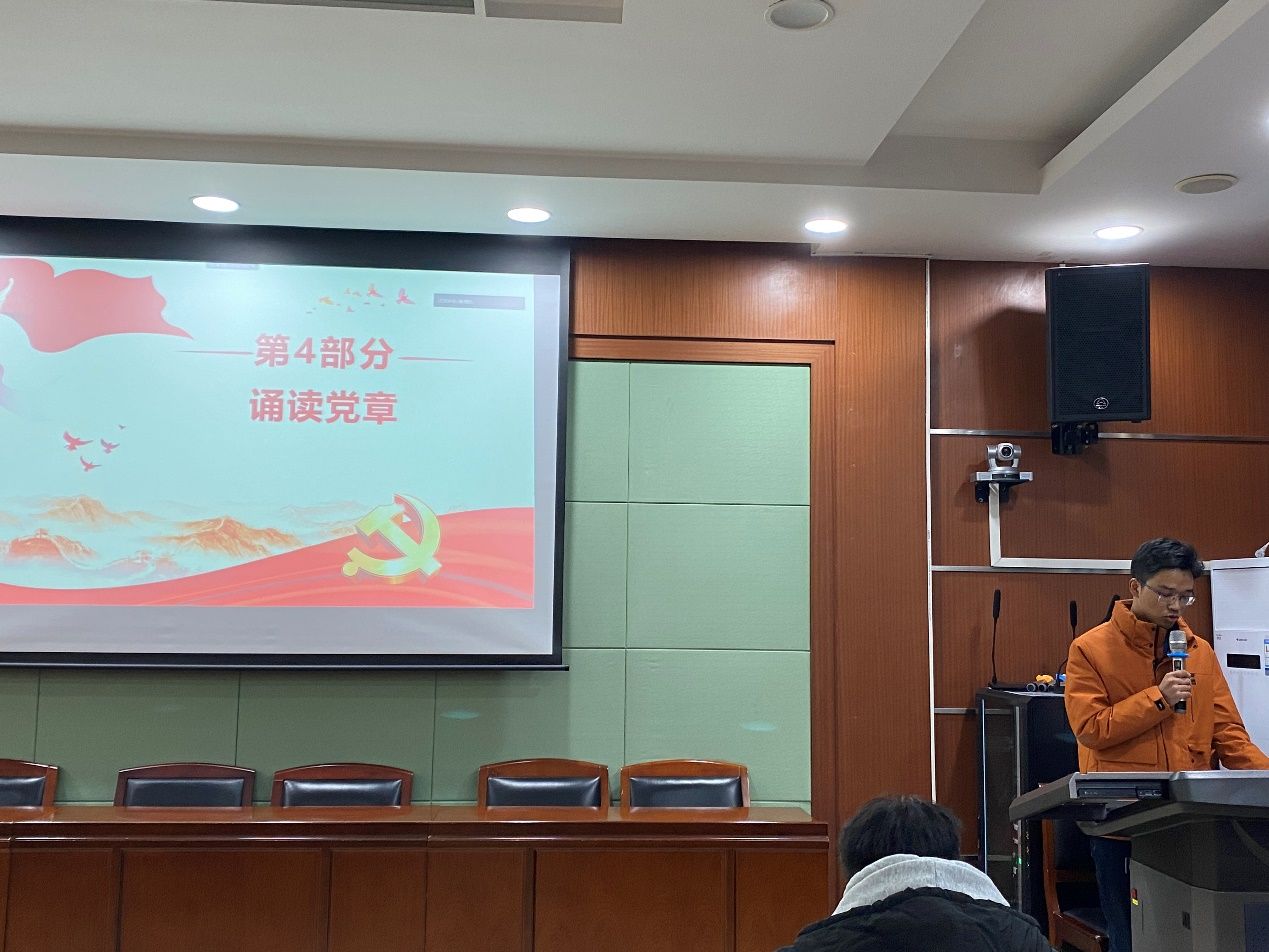 会议第二项,支部成员全体起立,面向党旗举起右拳,在卜瑞奇同志的带领下重温入党誓词。
