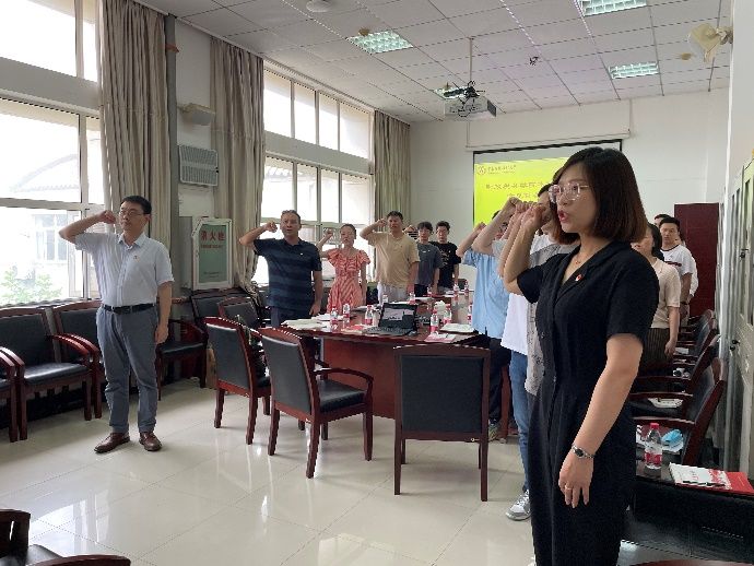 活动第二项,支部成员全体起立,面向党旗举起右拳,在69成人小说 党委副书记吴兴华同志带领下,重温入党誓词。