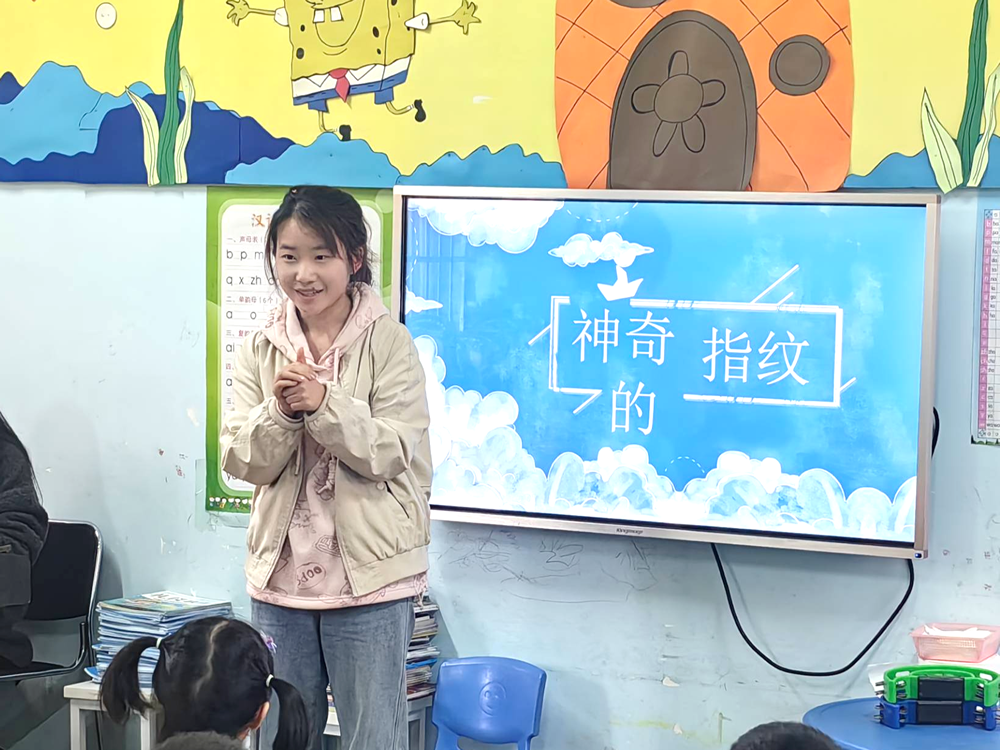 活动中,同学们组织小朋友们开展暖场小游戏,通过情景导入激发他们对指纹的兴趣,结合PPT展示有意识地引导他们观察比较指纹,培养观察能力和分辨能力。