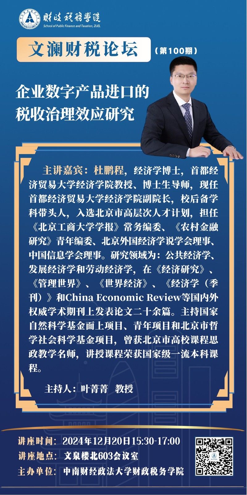 文澜财税论坛(第100期):首都经济贸易大学经济学院杜鹏程教授