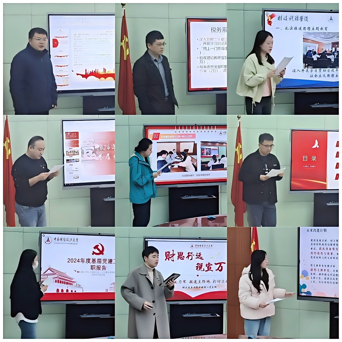 会前,各支部书记认真对照基层党建各项工作要求,就过去一年工作的主要做法、存在的问题和下一步工作思路进行总结梳理,提交了述职材料。会上,财政系党支部、税务系党支部、行政党支部、学硕研究生第二党支部、学硕研究生第三党支部、专硕研究生第一党支部、专硕研究生第二党支部、本科生第一党支部和本科生第二党支部进行了现场述职。