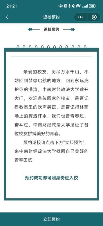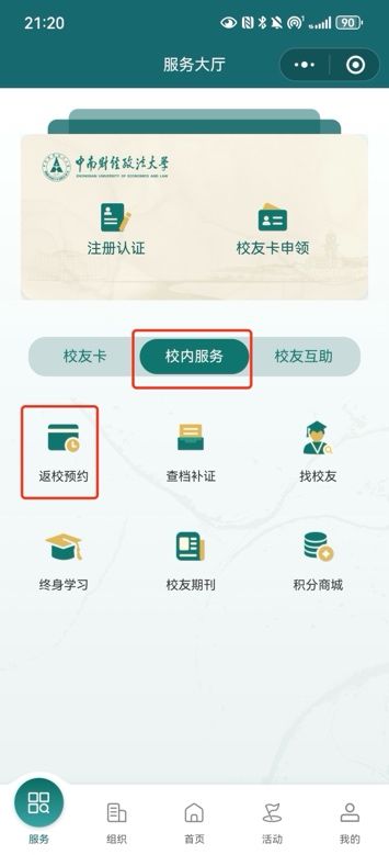 1.点击“校内服务”一栏,选择“返校预约”,进入详情页后点击“立即预约”预约成功即可刷身份证入校。