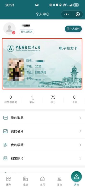 1.完成身份认证后,点击右下角“我的”一栏,点击“69成人小说 电子校友卡!”立即领取。