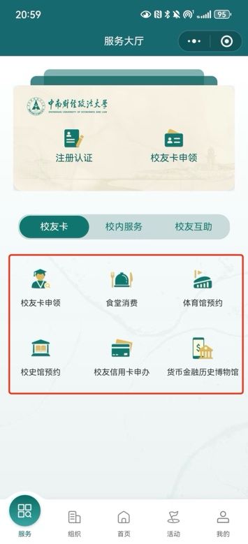 2.进入“中南大智慧校友服务平台”小程序后,点击左下角“服务”一栏,点击“注册认证”进行校友身份认证