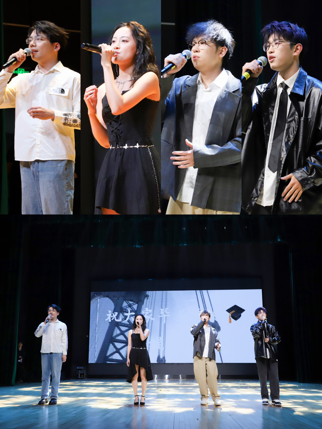熟悉的旋律响彻会堂,点燃现场一触即发的热情。“一串乱码”乐队带来表演——《干杯》《我记得》,为送毕晚会拉开序幕。