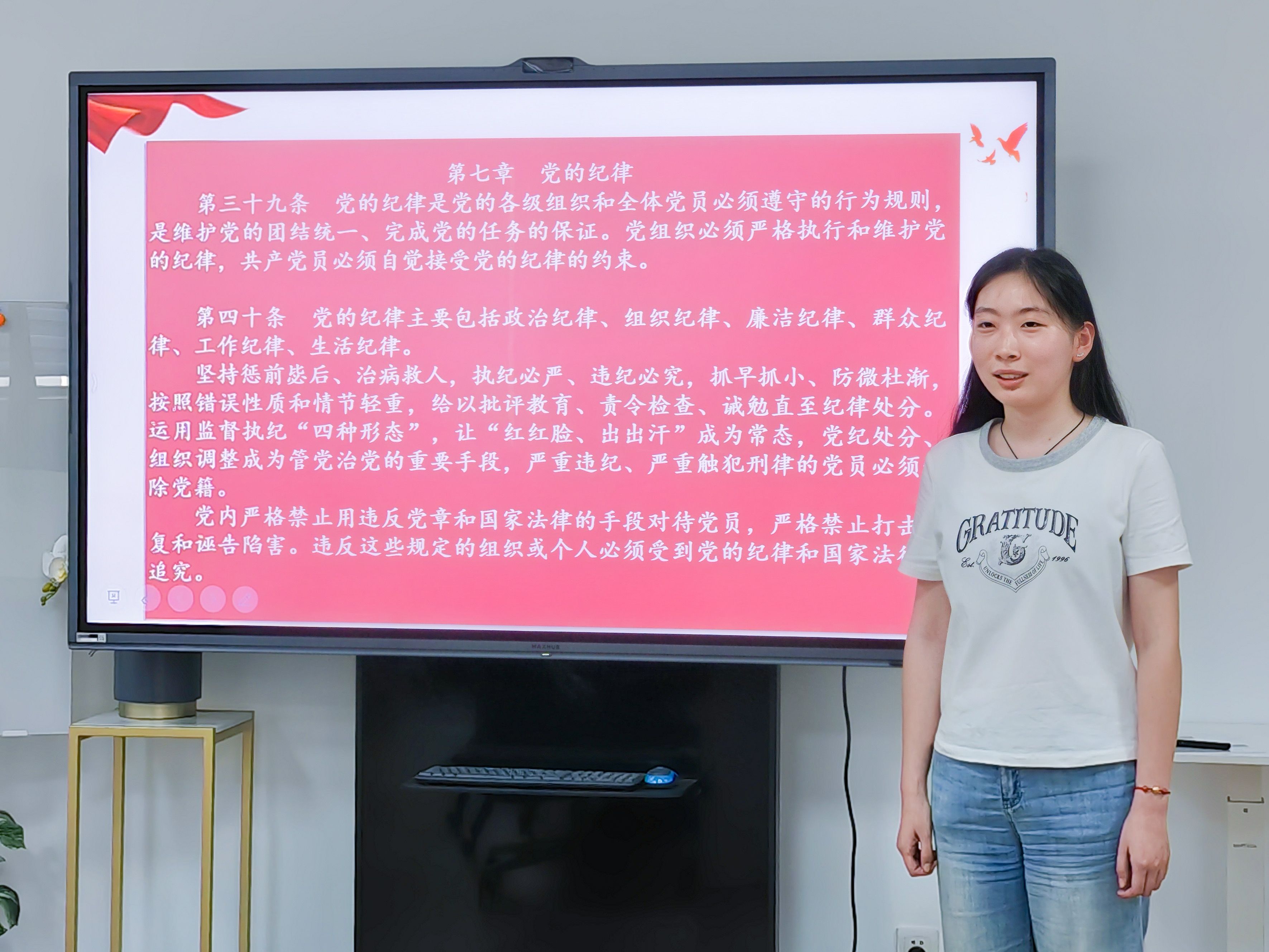 在主题学习环节,方茹慧同志领学习近平总书记在贵州、云南等地考察时就深入贯彻中央八项规定精神学习教育发表的重要讲话精神。习近平总书记指出,“党的领导是事业发展的根本保证。看一个地方党的领导和党的建设水平高不高,一个重要方面就是看政治生态好不好。”同学们在深学细悟中认真理解把握开展学习教育的重大意义,自觉增强学习教育的责任感紧迫感。方茹慧同志表示,作为一名党员,自己将紧跟党的步伐,深入学习领会习近平总书记重要讲话精神,提升自身能力,以优良作风践行使命担当,时刻准备为经济社会发展贡献力量,助力中国式现代化建设。