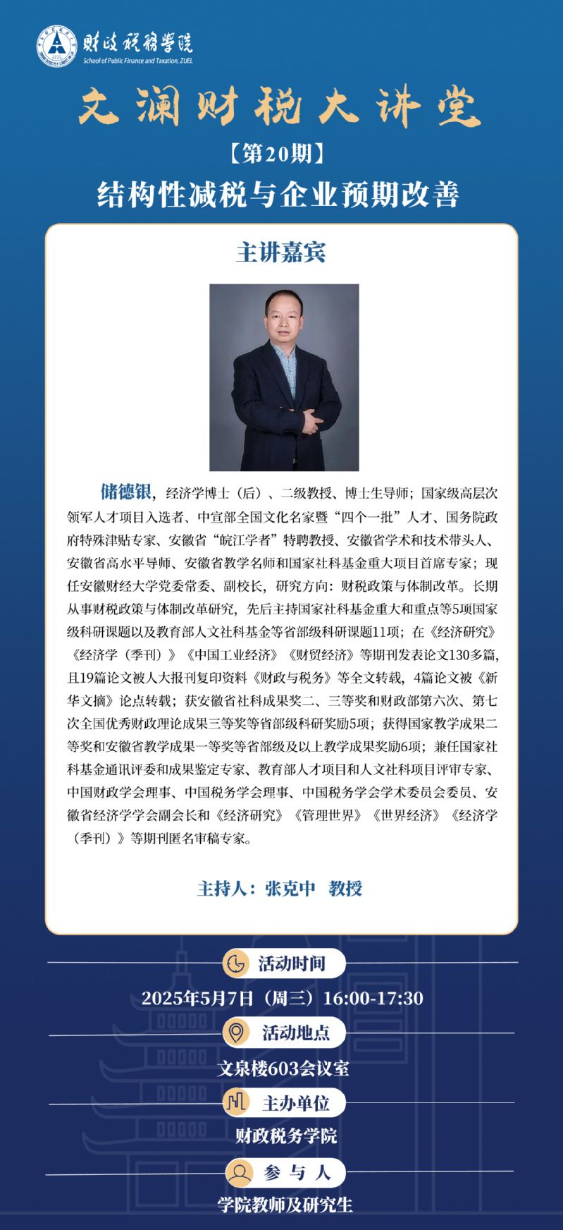 文澜财税大讲堂(第20期):安徽财经大学党委常委、副校长储德银教授