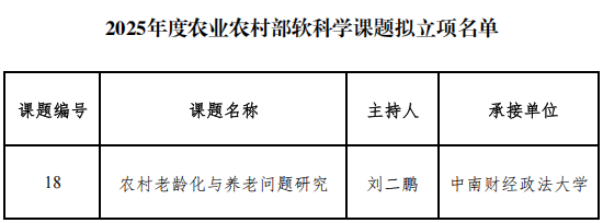 刘二鹏老师主持的课题“农村老龄化与养老问题研究”获得2025年度农业农村部软科学课题立项。该课题的基本定位是政策研究,旨在深入学习贯彻习近平总书记关于“三农”工作的重要论述,全面贯彻落实党的二十大和二十届二中、三中全会精神,落实中央经济工作会议、中央农村工作会议和中央一号文件部署,聚焦“三农”领域战略性、政策性、实践性重大问题开展。