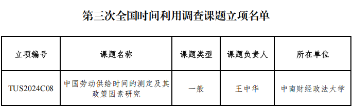 王中华老师主持的课题“中国劳动供给时间的测定及其政策因素研究”获得国家统计局第三次全国时间利用调查项目立项。该研究将依托权威微观调查数据,精确测量我国劳动者时间配置模式,深入分析劳动政策对个体时间利用的影响效应,为优化劳动力市场政策、提升民生福祉提供科学依据。