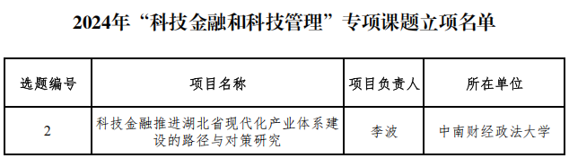 李波教授主持的课题“科技金融推进湖北省现代化产业体系建设的路径与对策研究”获得湖北省社会科学界联合会2024年“科技金融和科技管理”专项课题立项。该研究将深入剖析科技金融赋能区域产业升级的关键机制,聚焦湖北省情,提出构建具有全国竞争力的现代化产业体系的金融支持策略与实践路径。