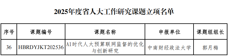 郭月梅教授主持的课题“AI时代人大预算联网监督的优化与创新研究”获得2025年省人大研究课题立项。该研究直面人工智能技术革新对财政监督带来的机遇与挑战,致力于探索预算联网监督体系的智能化升级路径,为提升新时代人大监督效能提供科技支撑和制度创新方案。