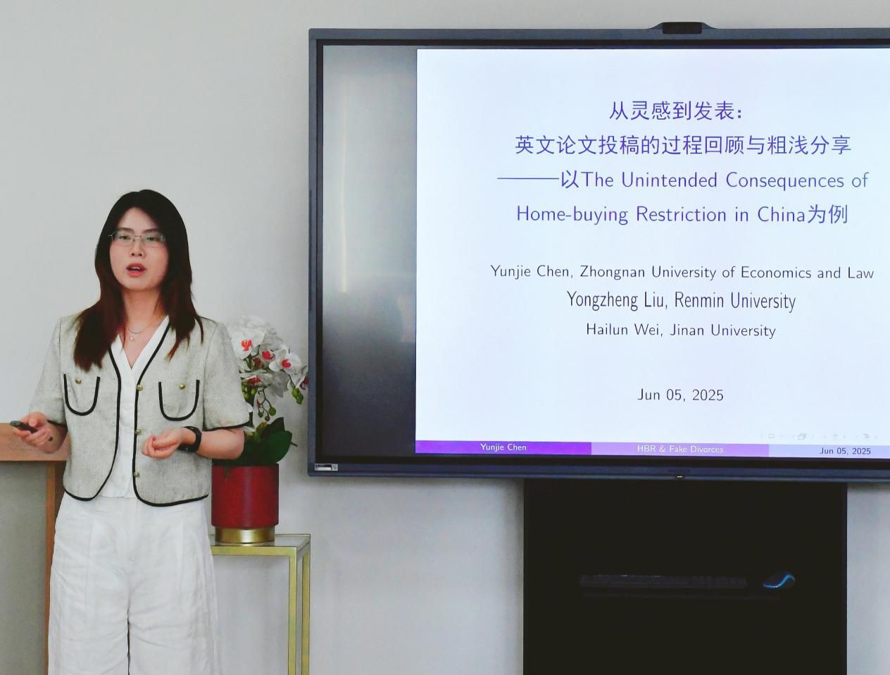 陈韵洁老师首先就实证研究的选题与构思过程进行分享。她指出,选题应立足现实问题,在阅读大量文献的基础上形成学术审美,积极与导师和同学交流,并从政策背景入手,结合数据收集与实证分析构建完整的研究框架。此外,研究者在论文写作中需重点解决两个核心问题:一是如何借助数据实现可靠的识别;二是通过实证结果分析,构建兼具学术价值与现实意义的完整研究叙事。