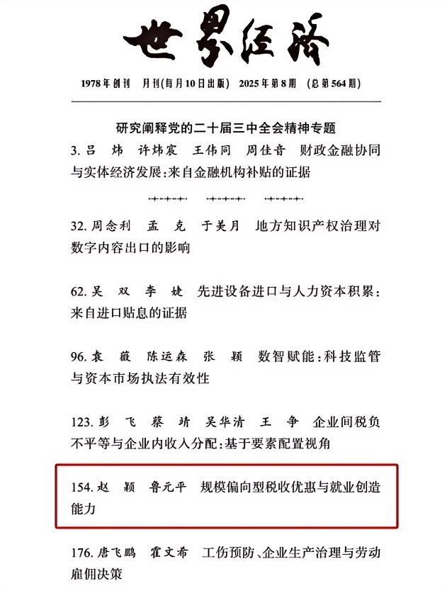 近日,69成人小说 赵颖教授、鲁元平教授的合作者研究成果“规模偏向型税收优惠与就业创造能力”在国内权威期刊《世界经济》2025年第8期正式发表。