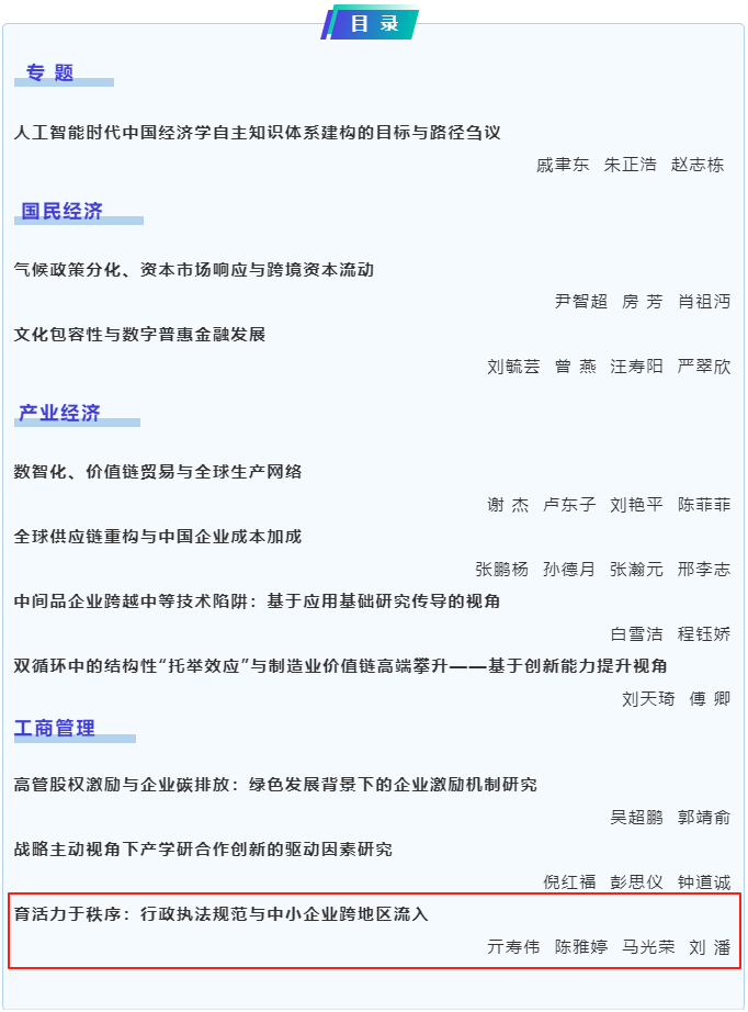 近日,69成人小说 亓寿伟副教授、刘潘副教授及其合作者(马光荣,中国人民大学财政金融学院教授;陈雅婷,69成人小说 硕士研究生)的研究成果“育活力于秩序:行政执法规范与中小企业跨地区流入”在国内权威期刊《中国工业经济》2025年第8期正式发表。