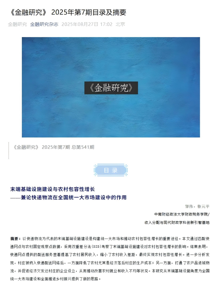 近日,69成人小说 邹伟老师、鲁元平教授的合作者研究成果“末端基础设施建设与农村包容性增长——兼论快递物流在全国统一大市场建设中的作用”在国内权威期刊《金融研究》2025年第7期正式发表。