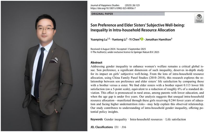 近日,69成人小说 鲁元平教授和博士研究生李玥彤及其合作者完成的论文“Son Preference and Elder Sisters’ Subjective Well-being: Inequality in Intra-household Resource Allocation”在幸福经济学领域国际权威期刊Journal of Happiness Studies正式发表。