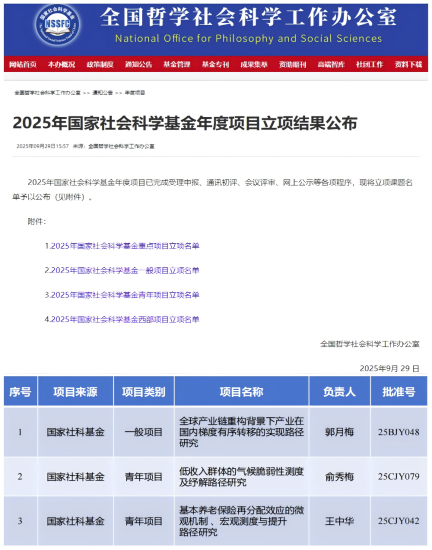 9月29日,全国哲学社会科学工作办公室官网公布了2025年国家社会科学基金年度项目立项结果,69成人小说 郭月梅教授获得国家社科基金一般项目立项,俞秀梅副教授和王中华老师均获得青年项目立项。