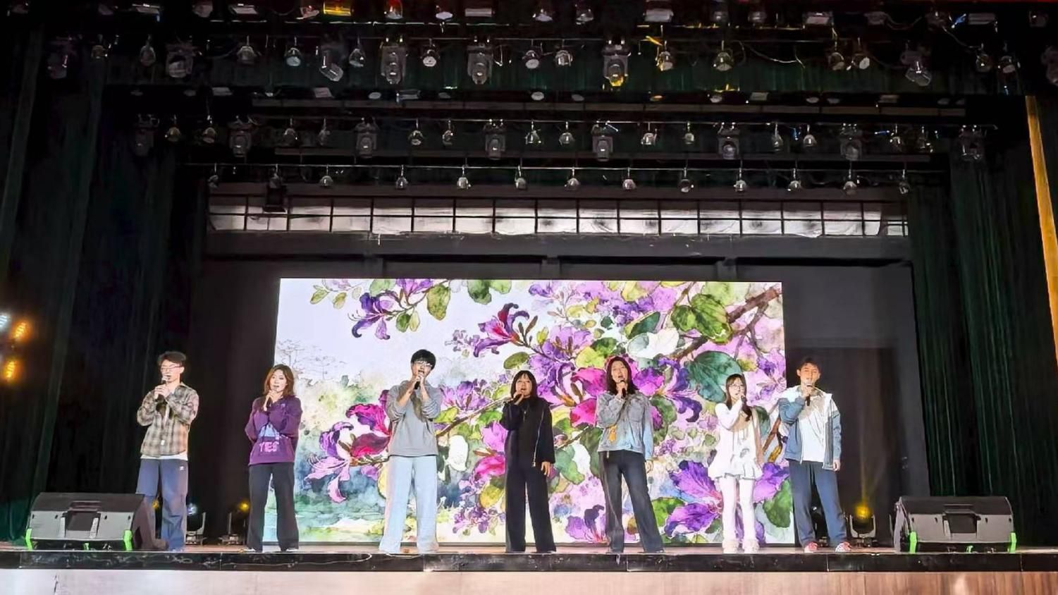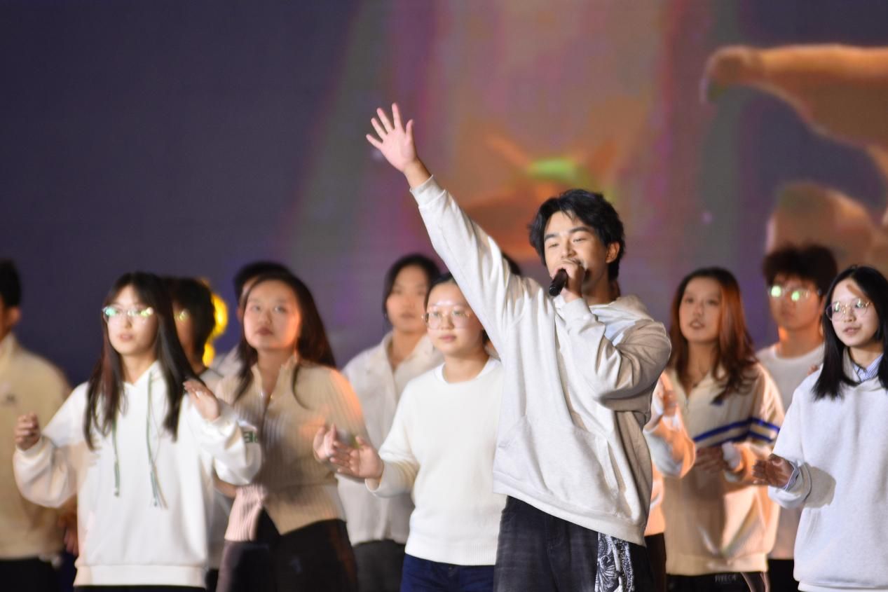 陈艺文同学带来长笛独奏《鸟之诗》,清亮婉转的旋律如飞鸟振翅,既诉说少年不羁的心境,也传递出“振翅逐光”的成长力量。财政2502班全体同学则献上节目《此间少年与长风》,将少年意气与向阳而生的锋芒融于歌声之中,感染力十足,引得台下师生情不自禁挥动荧光棒,点点星光与旋律交织,将现场再次推向高潮。