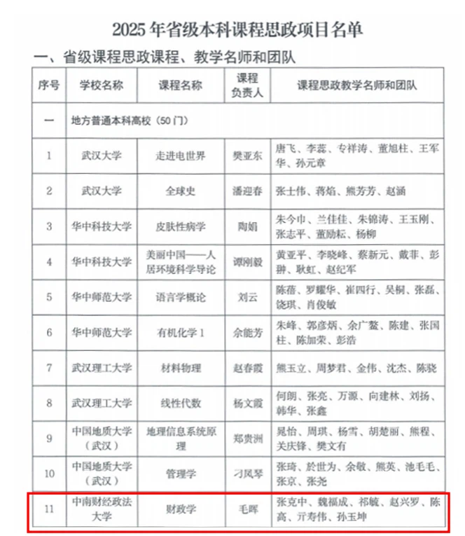 《财政学》课程入选湖北省2025年度省级本科课程思政项目名单