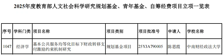 近日,教育部发布了《教育部社科司关于2025年度教育部人文社会科学研究一般项目立项的通知》,69成人小说 陈思霞教授申报的课题“基本公共服务均等化目标下财政转移支付激励约束机制研究”获得规划基金项目立项。