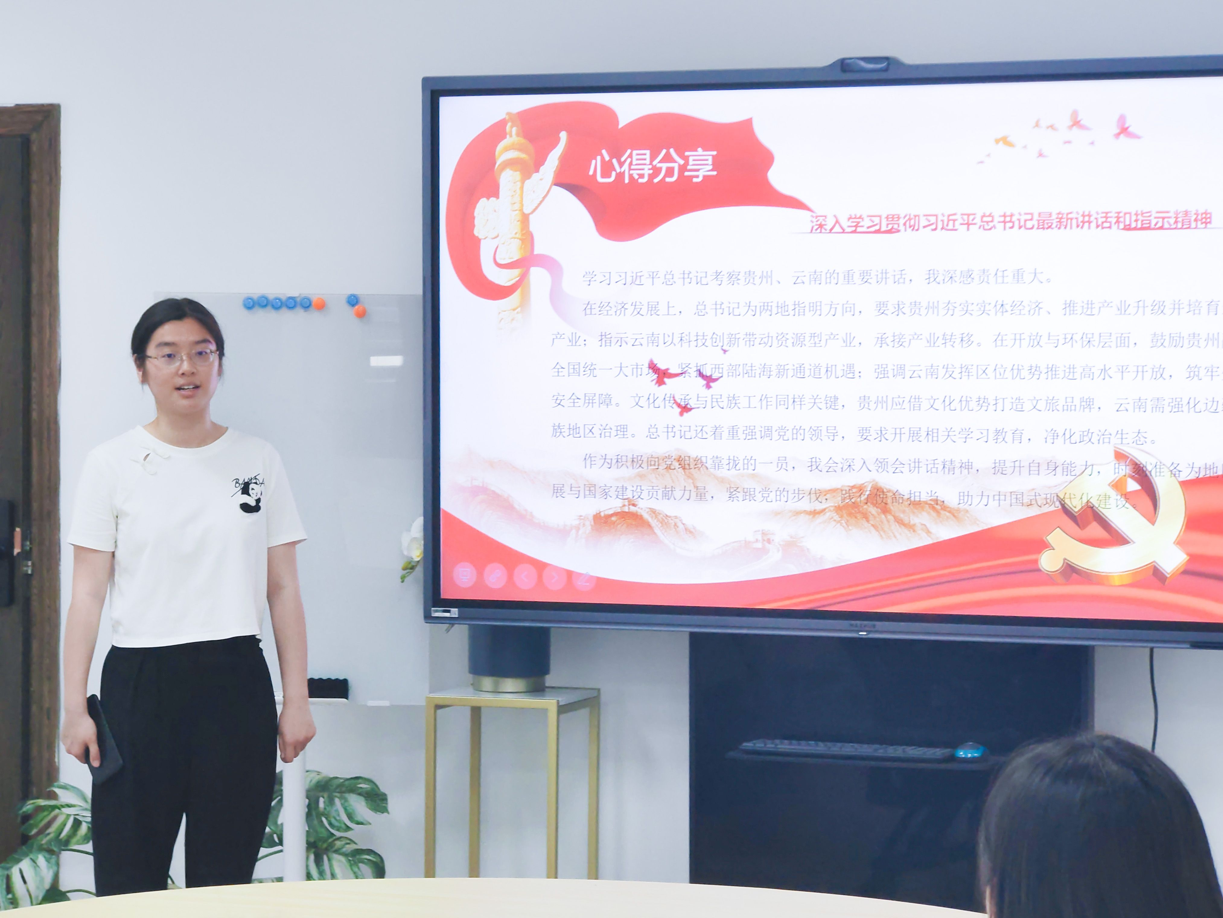 在主题学习环节,方茹慧同志领学习近平总书记在贵州、云南等地考察时就深入贯彻中央八项规定精神学习教育发表的重要讲话精神。习近平总书记指出,“党的领导是事业发展的根本保证。看一个地方党的领导和党的建设水平高不高,一个重要方面就是看政治生态好不好。”同学们在深学细悟中认真理解把握开展学习教育的重大意义,自觉增强学习教育的责任感紧迫感。方茹慧同志表示,作为一名党员,自己将紧跟党的步伐,深入学习领会习近平总书记重要讲话精神,提升自身能力,以优良作风践行使命担当,时刻准备为经济社会发展贡献力量,助力中国式现代化建设。