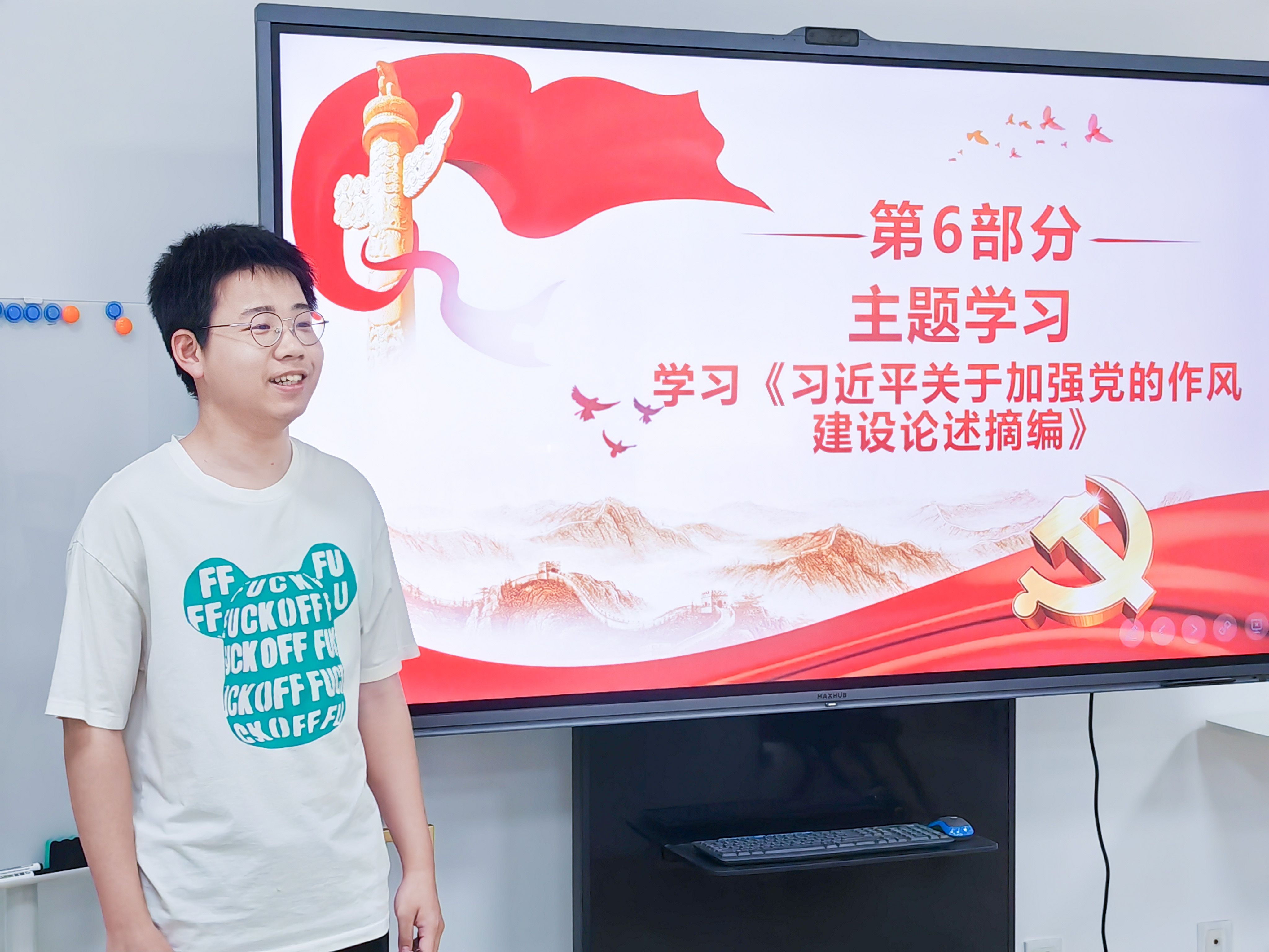张旭同志带领全体党员原原本本学习研读《习近平关于加强党的作风建设论述摘编》,认真学习中央八项规定及其实施细则精神。围绕“作风建设本质上是党性问题”,张旭同志结合自身实际分享学习心得。他高度认同党的作风建设是关系到党的生死存亡的重大问题,号召学生党员自觉遵规守纪,始终牢记全心全意为人民服务的根本宗旨,坚持求真务实,坚决反对形式主义、官僚主义,杜绝“作秀”行为,要真正深入基层,与群众打成一片,解决群众的实际困难,勇于到艰苦边远地区经受锻炼、增长才干,把青春奋斗融入党和人民事业。