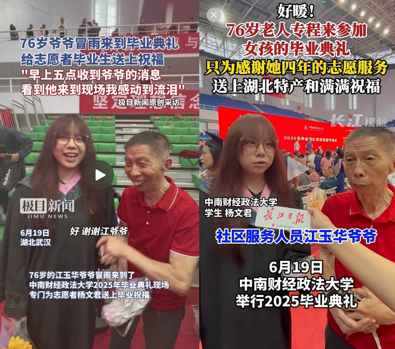 6月19日,学校2025年毕业典礼现场上演暖心一幕:76岁的江零社区居民江玉华冒雨来到南湖校区艺体中心,专程为学院2025届本科毕业生杨文君送上毕业祝福,感谢其大学四年间为社区志愿服务的持续付出。这一场温情互动,成为我院志愿服务工作成效的生动缩影。