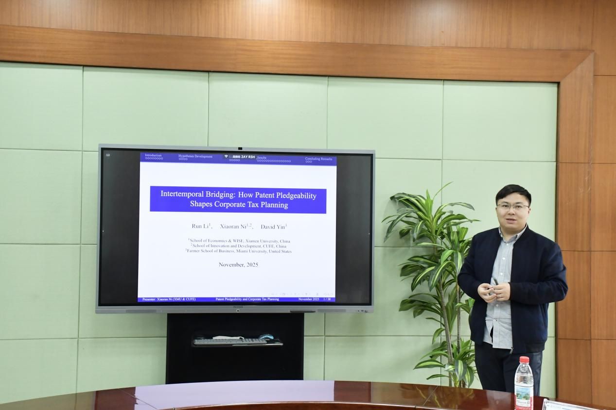 11月10日上午,文澜财税论坛(第111期)于文泉楼北603会议室顺利举行。本次讲座邀请到中央财经大学创新发展学院倪骁然教授做题为“Intertemporal Bridging : How Patent Pledgeability Shapes Corporate Tax Planning”的学术报告,讲座由财政税务学院赵颖教授主持,学院部分教师和研究生共同参与了本次学术交流活动。