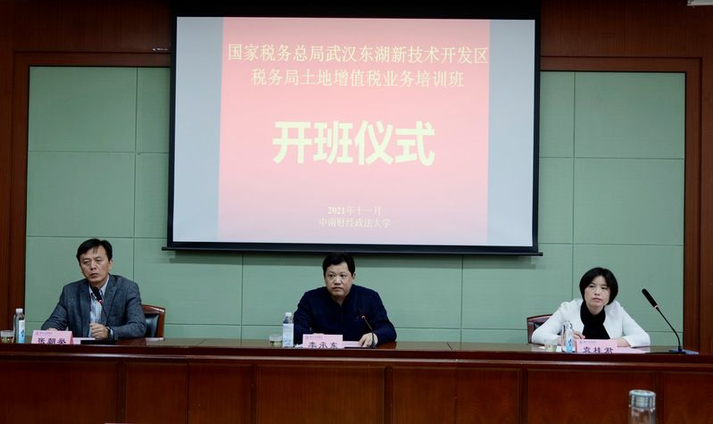 11月1日上午,国家税务总局武汉东湖新技术开发区税务局土地增值税业务培训班在我校南湖校区文泉楼403室举行开班仪式。出席开班仪式的领导有武汉东湖新技术开发区税务局党委委员、总会计师李承东,中南财经政法大学财政税务学院党委书记袁桂君。开班仪式由财政税务学院高端培训中心主任张朝举主持。